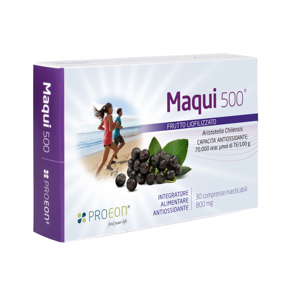 Il MAQUI 500® (confezione da 30 compresse), integratore a base di maqui, unico per dose e concentrazione di principio attivo: ogni compressa contiene 500 mg di maqui frutto liofilizzato, è masticabile (può essere assunta anche per via sub-linguale), con potere antiossidante pari a 70.000 µmol di TE/100g della scala Orac, di provata efficacia, particolarmente apprezzato in ambito sportivo, per i notevoli effetti energizzanti.